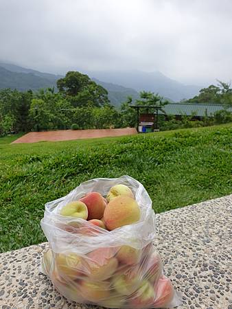 營主熱情邀我們去採桃子,露營還可以採果,真好。