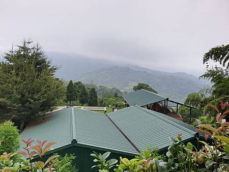 從入口處可以看到露營屋和雨棚區的屋頂,以及營區面對的山景。