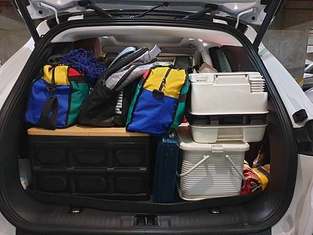 露營傢私分類清楚,一口氣將所有傢私搬下樓、各就各位(行李箱分兩排放置,看不到的內側一排是帳篷、寢具收納袋和桌椅,客廳帳、冰桶和一日行李放在後排座位),出發!