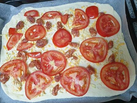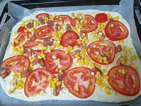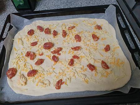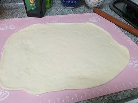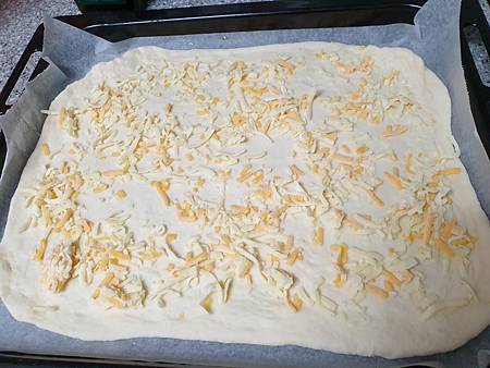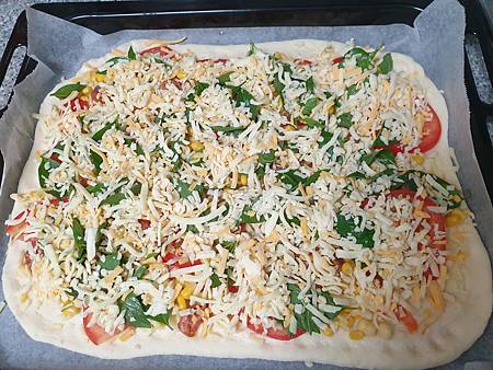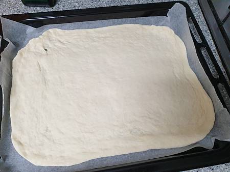 將麵皮舖在烘培紙上,餅皮外緣稍微捏厚一點,可以防止食材加熱後汁液外流。