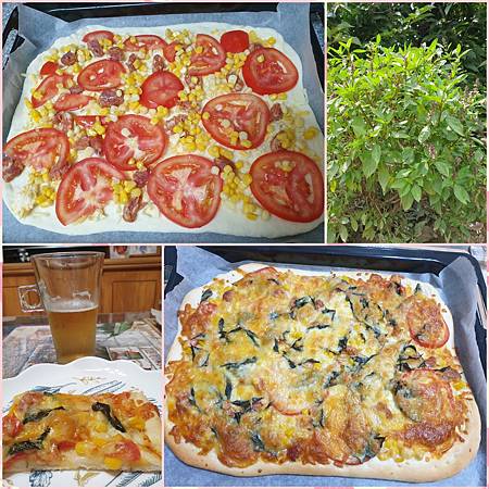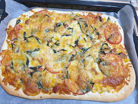 180度,20分鐘,香氣濃郁的蕃茄九層塔披薩出爐了!