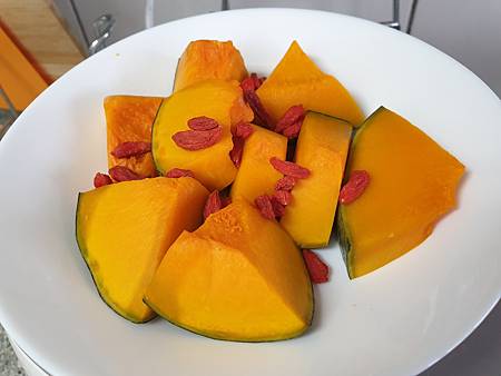 OJS冷不防來一句:『今天要拜拜』,腦袋瞬間清醒了,冰箱現有食材並不多,腦海中將為數不多的食材拼拼湊湊僅有五道菜,決定灑點枸杞在南瓜片上面裝飾,湊成六道菜,早餐就改吃蛋餅吧!