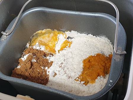 再加入一大匙橄欖油後放入麵包機內打成麵糰。