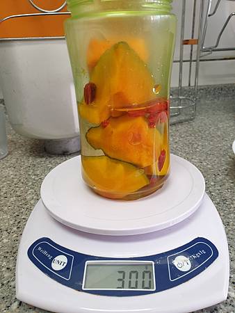 拜過後的南瓜和枸杞拿來做饅頭好了,加水共300克(麵粉量的60%),打成泥。