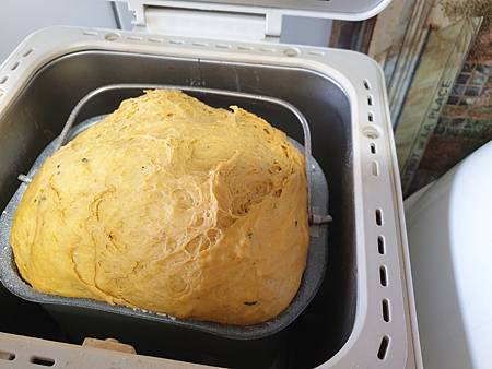 麵包機的『包子模式』行程(沒有饅頭模式)走完,麵糰已發酵成兩倍大。