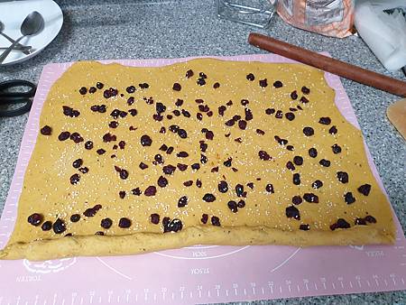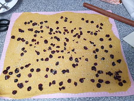 三擀三折後將麵團擀成薄片,撒上蔓越莓乾和白芝麻。