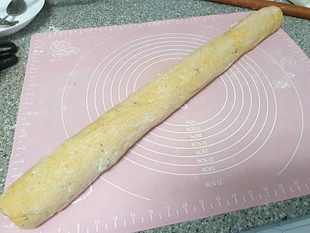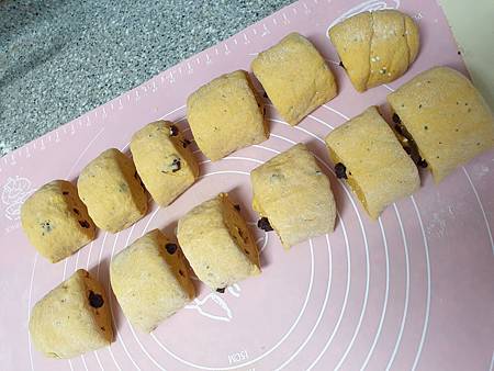 切好後放置於烘培紙上, 放入烤箱內二次發酵30分鐘,烤箱內放一杯熱水以保持發酵所需的溫度與濕度。