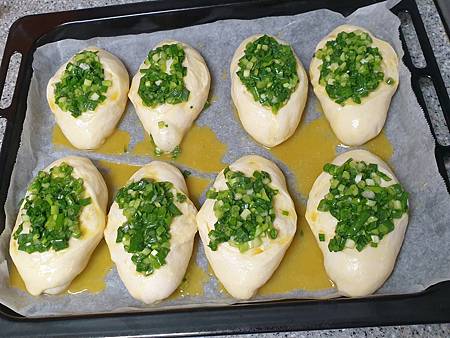 將蔥花置於麵包上,最後用刷子沾蛋液塗在麵包表面。
