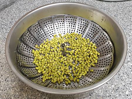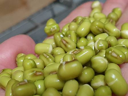 泡水8小時的綠豆膨脹、破殼,甚至都冒出小芽了。