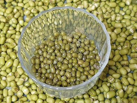 泡水前的綠豆(杯裡)和泡水後的綠豆(杯外)比較一下,顏色和大小都不一樣了。