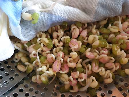 只是這綠豆還真見不得一點光線,我也就一天一次淋水時迅速地觀察、拍張照片,豆子就變紅了。