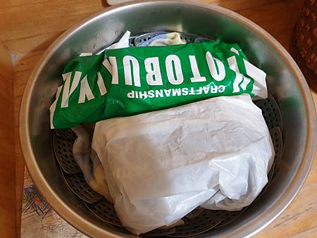 劍山許久未用,有些鐵銹髒污,先用塑膠袋包起來再輕輕置於綠豆芽上。