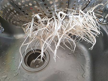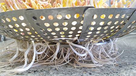 第二天的下午,小芽已紛紛從蒸架的小孔往下扎。