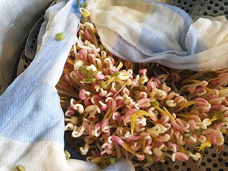 據說豆芽的根部沒營養、難消化,見光變紅的豆子據說會苦、不好吃,通通挑掉。
