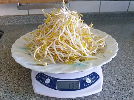 可能量太少(僅有30克綠豆)、太稀疏,也可能是讓它自由發展到第三天才施予重壓,上面雖是齊頭式平等,豆芽本身卻有點歪扭。
