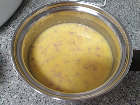 鮮奶混合液降溫後加入3克(約麵粉的1%)的酵母粉靜置10分鐘待酵母粉活化。