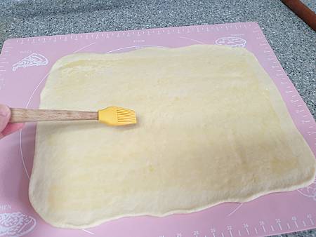 薄刷一層融化的奶油,邊緣留一公分不刷,較好黏合收口。