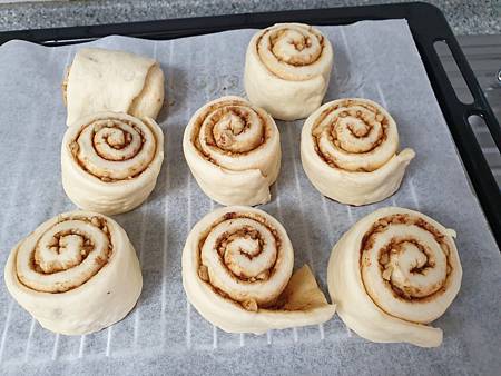 發酵好的肉桂卷圓乎乎的,還有一個胖到站不住,跌倒了。
