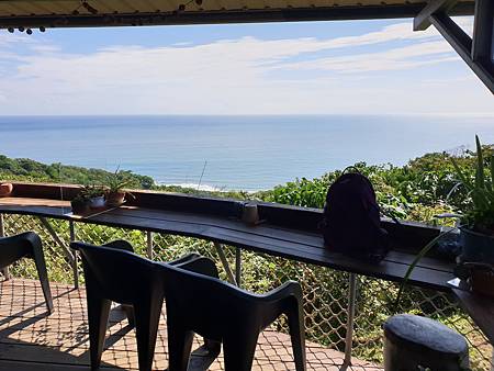柱子後面這位住客晚我們一天入住,來自嘉義,經常開車五個小時來『小阿姨民宿』,哪兒都不去,就坐在這露台看海、放空,自己準備食材煮三餐。