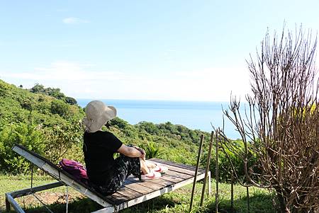 斜坡上的樹下有一個木躺椅,坐在上面既有樹蔭蔽日,又有超廣角的海景。