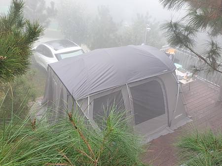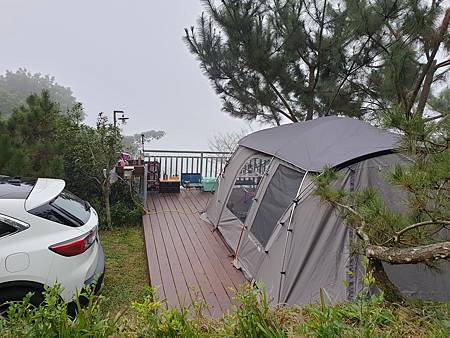 我們看了露營專家何師父的建議選了位置稍低的D5營位,這裡位於營區邊陲,視野不是很開闊,但是隱秘性極高,在雲霧縹緲的松樹下頗有世外桃源之感。