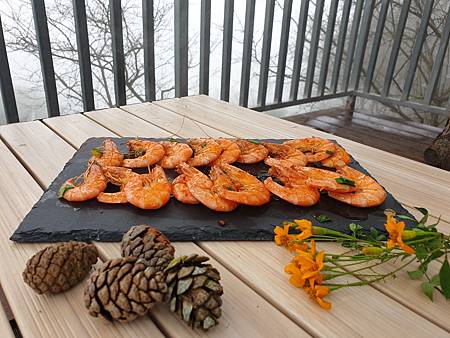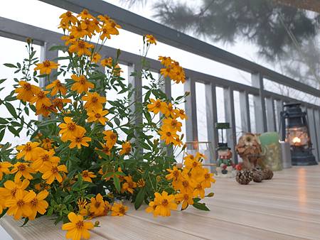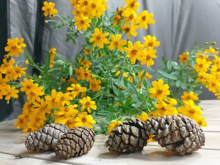 營區的工作人員正在修剪萬壽菊,給了我一束花,我在樹下又撿了幾顆松果,萬壽菊和松果把我的餐桌點綴得秋意甚濃。