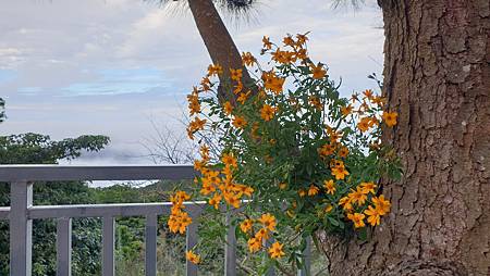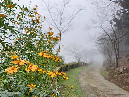 小徑旁有盛開的萬壽菊,花香撲鼻。