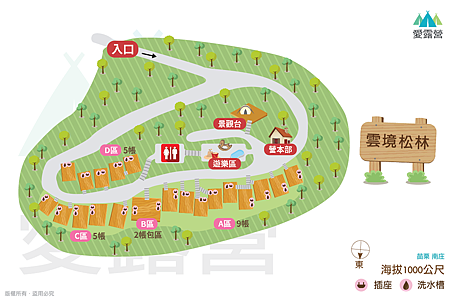 雲境松林露營區的營位配置圖,每一個營位都有自己的水槽,相當方便