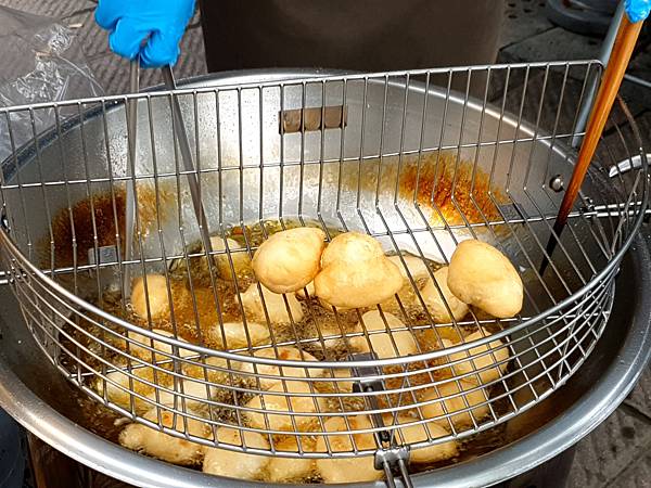 幸福白糖粿的年輕帥老闆雙手忙著炸白糖粿,嘴裡不停地述說著關於白糖粿的故事,讓我們忍不住站在攤前乖乖聽課。