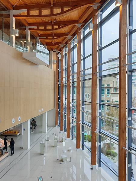 在這挑高12米的大廳屋頂是一個『魚腹樑』結構,觀之宛如這個三角形玻璃盒裡的一艘船,而大廳裡大量運用木頭結構也宣示了嘉美館對『木都』文化的重視,如同其透過藝術作品呈現了『畫都』的精神。