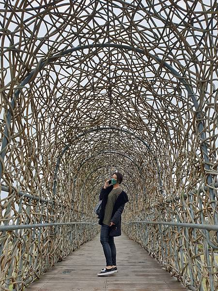 藤編的甬道,在日換星移時所呈現的光影變化,猶如阿里山火車蜿蜒行駛在森林時窗外風景的變化。
