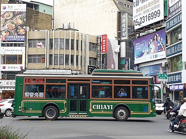 在圓環處捕捉到嘉義市的電動公車身影,外型復古懷舊,此為中山幹線的綠色車型,車廂外沒有煩人的廣告,不愧為『畫都』,嘉義市展現了最佳城市美學。