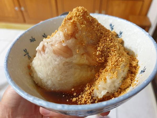 用中部帶回來的月桃葉包粿粽,我家老爺堅持要加入他的台南味:淋上醬汁、撒滿花生粉。