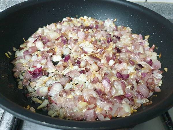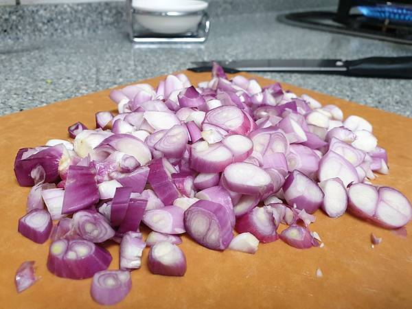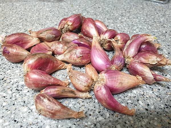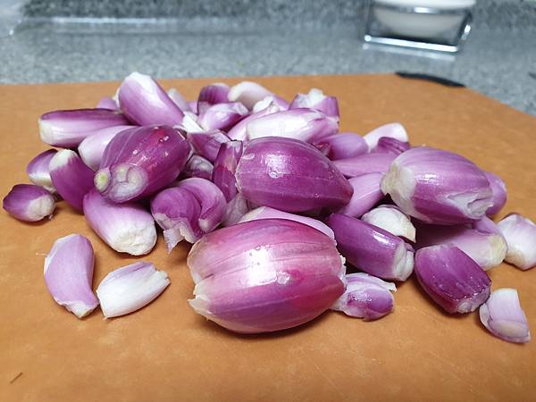 褪去外膜的紅蔥頭色澤豔麗,非常好看。
