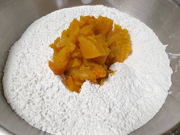 邊揉邊加入冷水(約500 cc),這時揉麵團要非常小心,南瓜還很燙手。