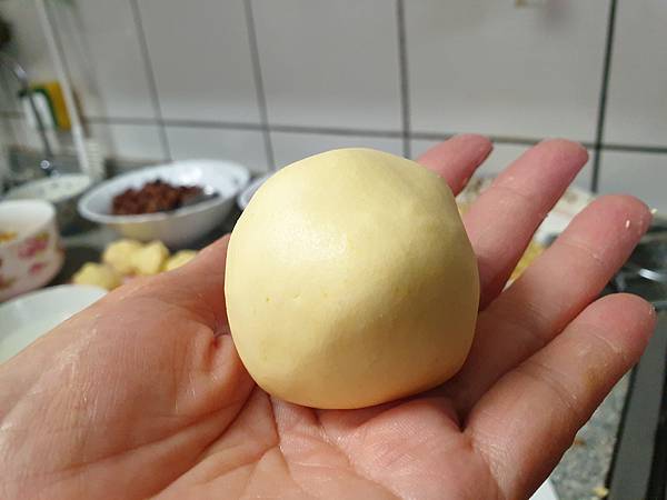 糯米糰揉至光滑即可,加了南瓜的糯米糰是淡黃色的。