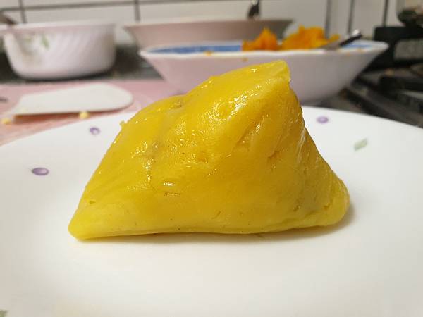 覺得白色粿粽太無趣,想試做漂亮的粿粽,將剛蒸好滾燙的南瓜丟進糯米粉中權當『粄娘』,可以增加糯米糰的Q度。
