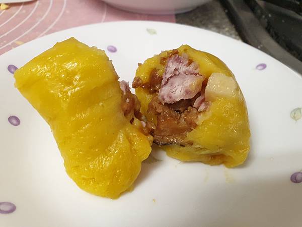 蒸過的南瓜粿粽艷黃亮麗,口感如何還不知道,先呈現了超美的視覺效果。