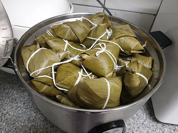 一串粿粽正好可以進電鍋一次蒸,外鍋一杯水即可,大約20分鐘就蒸好了,蒸好的粿粽明顯已膨脹成胖乎乎的粽形。