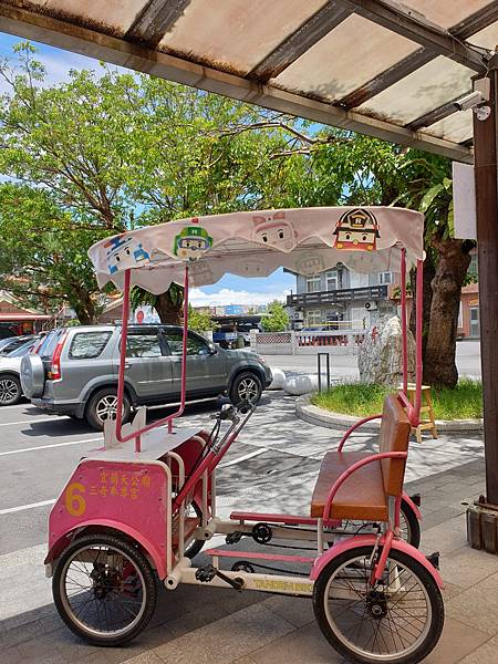 粉紅超跑有車頂遮陽,前面還有置物籃足以放置兩個人的背包,非常方便。
