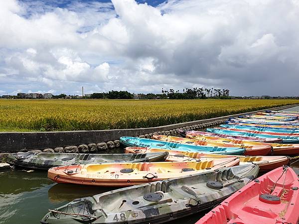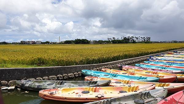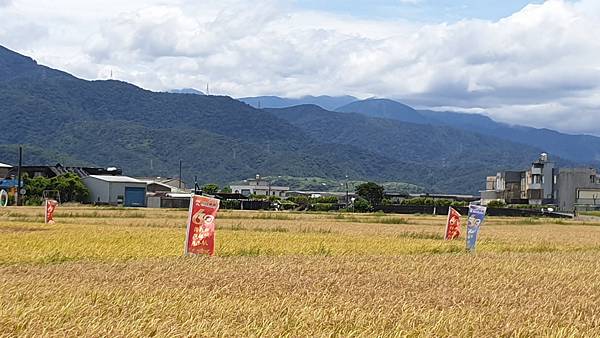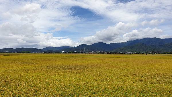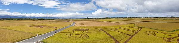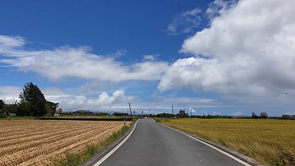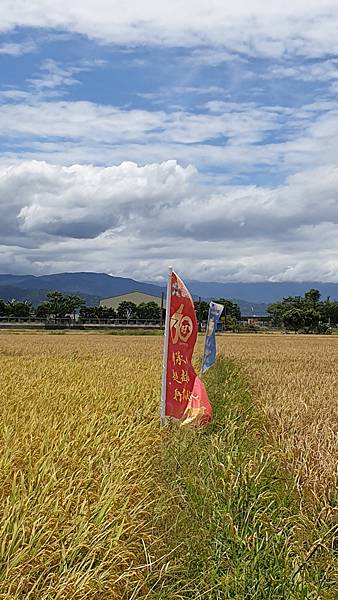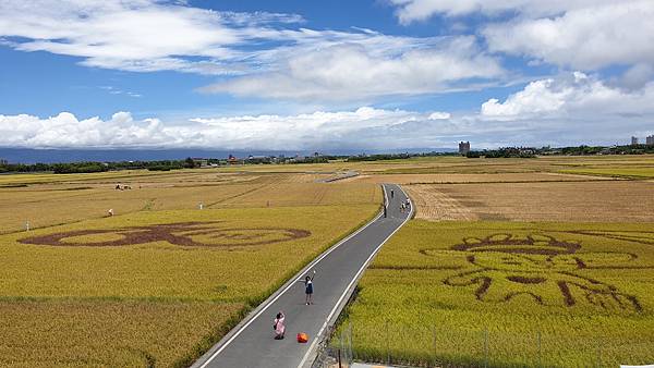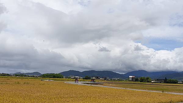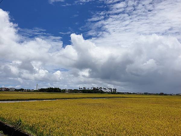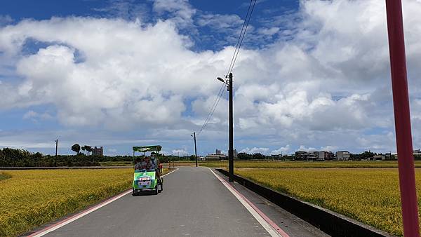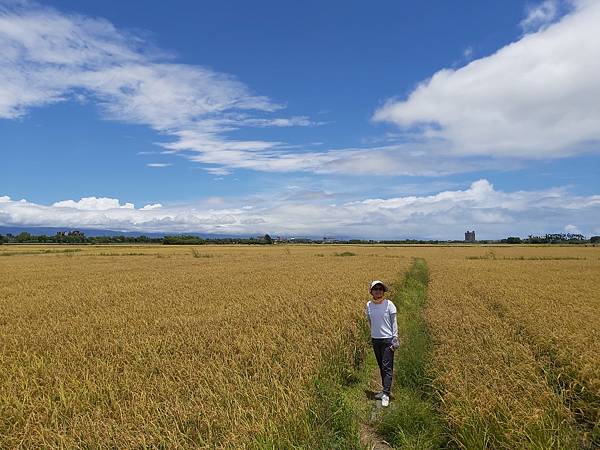 藍天白雲、無垠的田野、飽滿的金黃稻穗,可以預見農人豐收時的喜悅,拍照時可別誤踩至稻田裡了。