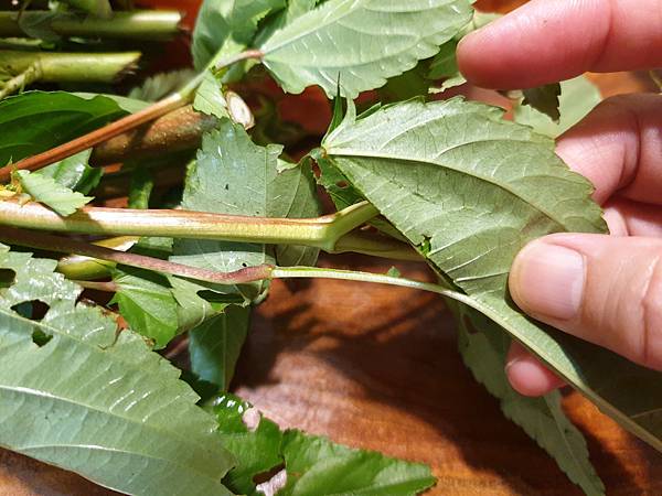 麻薏葉脈纖維很粗,須一葉一葉將葉子從葉脈上撕下來。