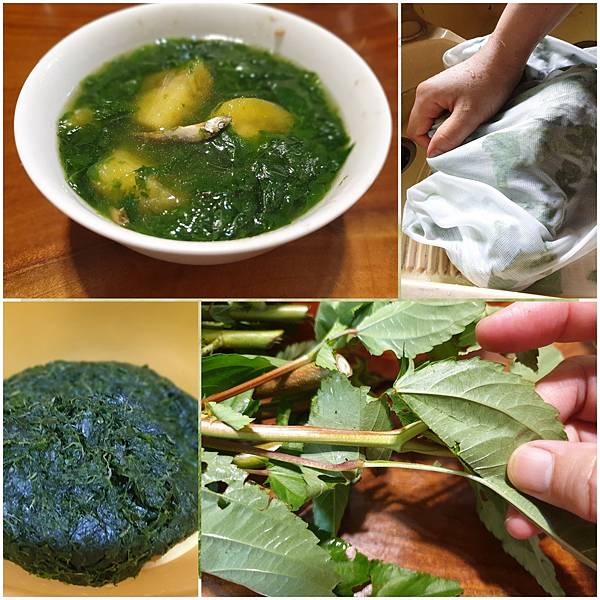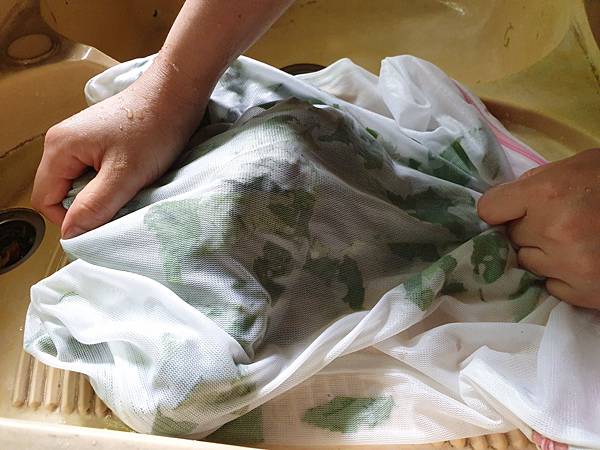 我們的做法有點搞剛,家裡有一個麻薏專用洗衣袋,將麻薏葉子裝在袋內,整袋放在水龍頭下,邊搓揉邊沖洗,把麻薏苦澀的汁液沖走。