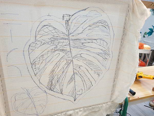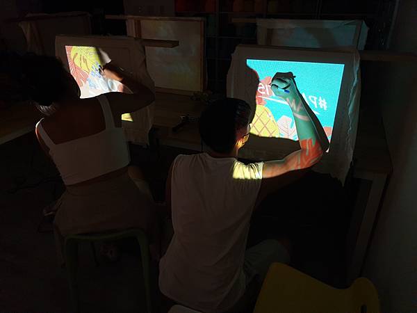 較早抵達的大妞小倆口已經就位,專心就著投影在底布上的圖案描繪出圖形。
