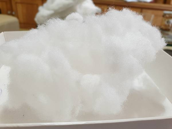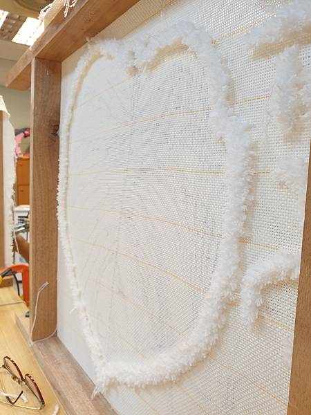 一條絨線有八股細線,一槍打出去後細線四散,因此不同顏色的細線參差交錯,有空再來慢慢整理撥回原位吧!