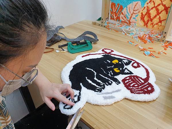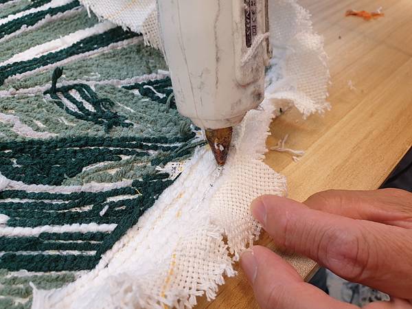 然後將簇絨毯切割下來,記得要留約2公分邊布方便黏貼收邊。