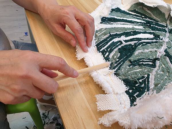 毯子背面黏上止滑墊,主要作用是當踩腳墊,可是花了許多時間和心血完成的作品,怎麼捨得踩在腳底下呢?