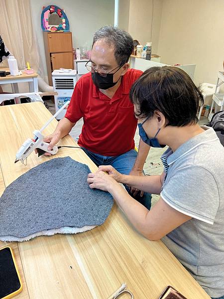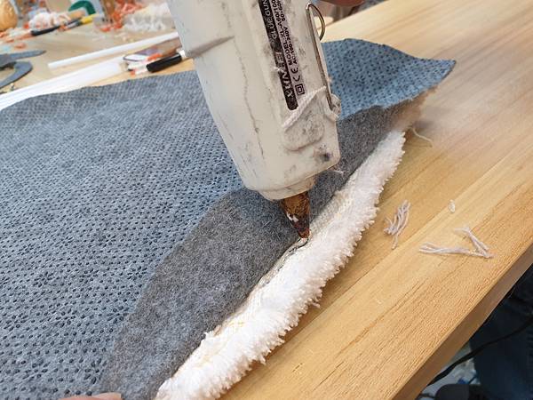 OJS負責拿熱熔膠槍,沿著布邊上膠。