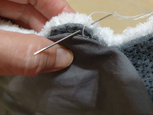 將止滑墊和抱枕套手工慢慢縫合,止滑墊雖厚,倒是跟一般厚布一樣,不難穿過。