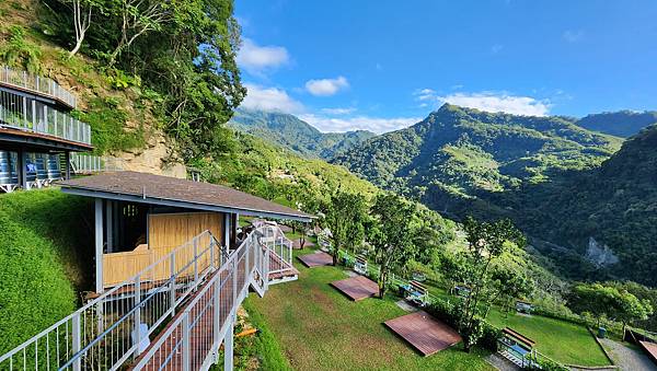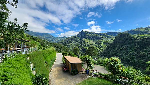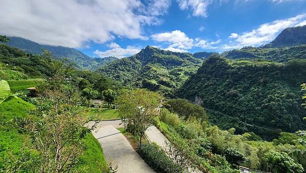 從高處俯瞰營區與山谷,藍天白雲下的景色秀麗怡人。